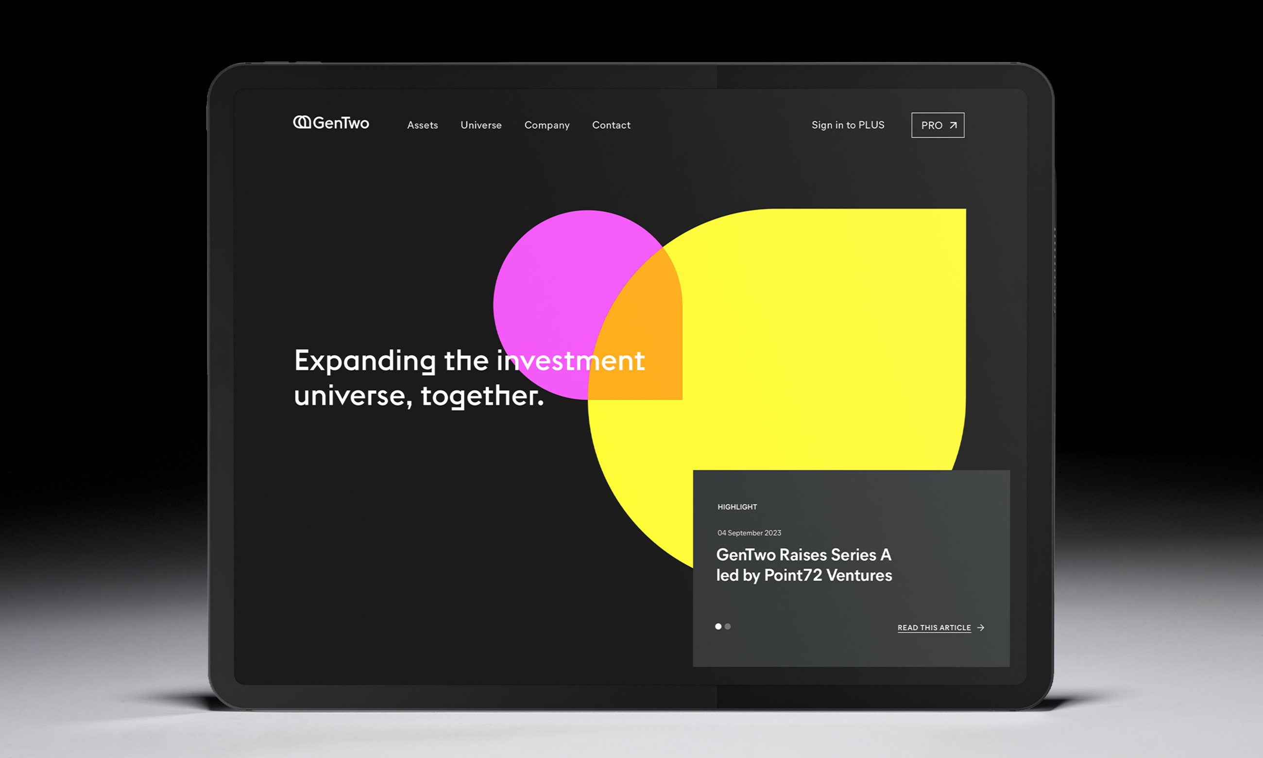 GenTwo, ein weltweit tätiges B2B-Fintech-Unternehmen, revolutioniert den Markt mit ihrer Strategie, sämtliche Vermögenswerte investierbar zu machen. GenTwo hat expandiert und wollte diese Veränderung visuell unterstreichen. Eine Veränderung, die nicht nur von der Ästhetik getrieben ist, sondern auch von ihrer Entwicklung als Unternehmen. Im Kern standen die Werte «grenzenlos», «mutig» und «authentisch», die im neuen Design der modernen UX sowie in der Farbpalette und Schriftart manifestiert wurden. Zusätzlich entstand eine skalierbare, AI-basierte Bildwelt, welche die Assets von GenTwo in eigenständiger Art illustriert.